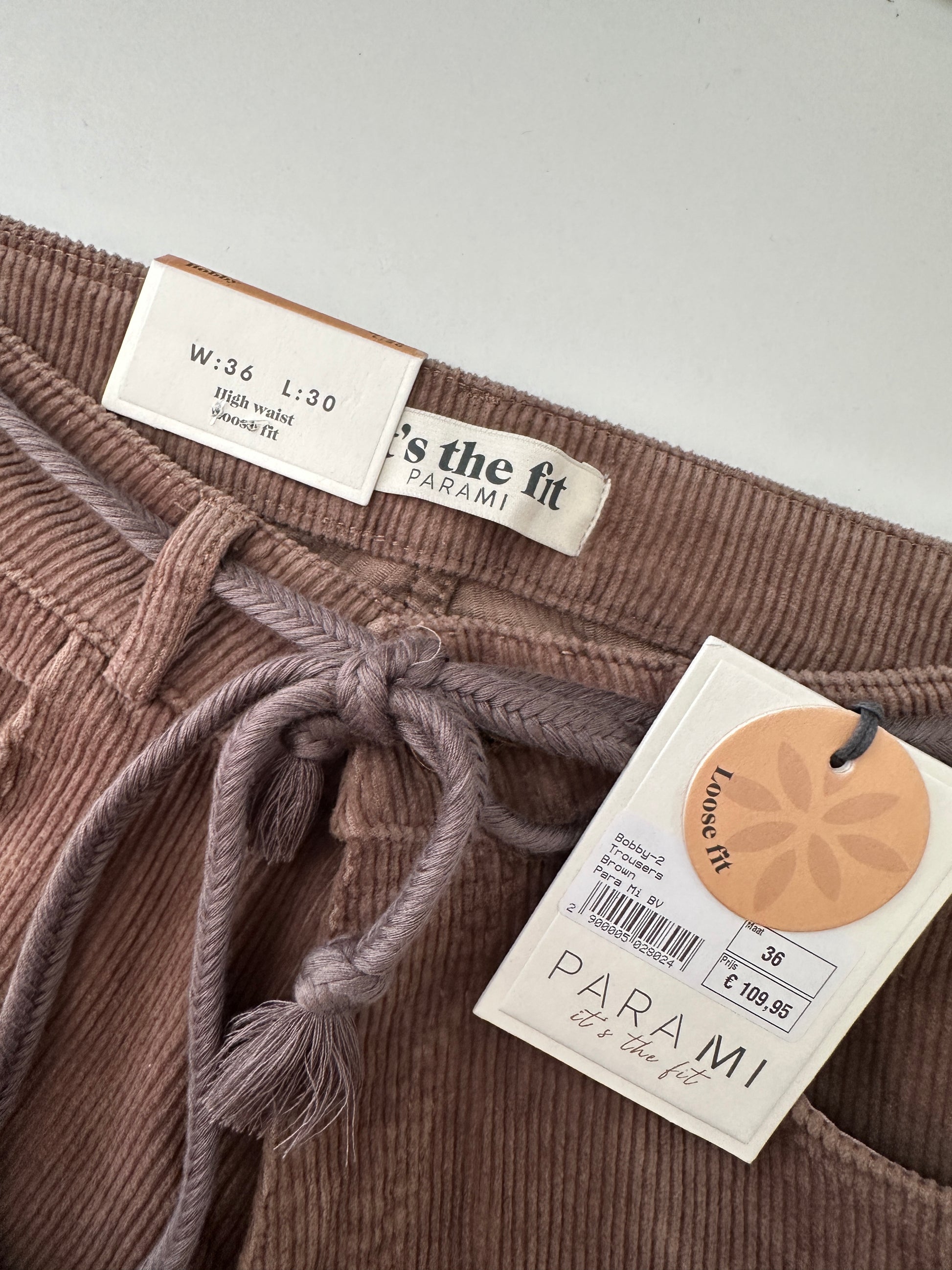 Model: Bobby Broek – loose fit, hoge taille, 5-pocket met knoop- en ritssluiting, inclusief gevlochten ceintuur
